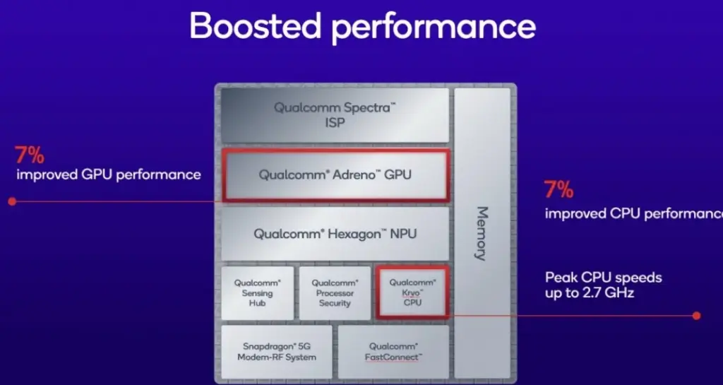 Menurut Qualcomm, peningkatan ini memberikan kenaikan performa CPU sebesar 7%.