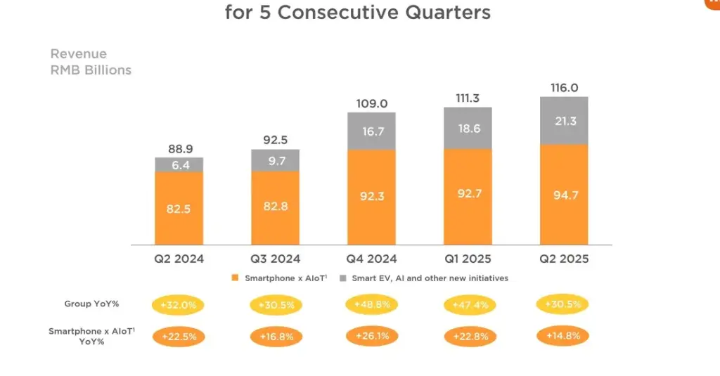 Selular.id – Xiaomi kembali mencatatkan performa keuangan yang kuat pada kuartal kedua tahun 2025, melanjutkan tren positif yang telah berlangsung selama lima kuartal berturut-turut. Total pendapatan grup Xiaomi mencapai rekor tertinggi sebesar CNY 116 miliar, tumbuh 30,5% dibandingkan kuartal yang sama tahun sebelumnya. Ini juga menjadi kuartal ketiga berturut-turut di mana pendapatan Xiaomi melampaui angka CNY 100 miliar.