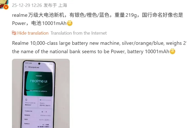 Perangkat yang disebut-sebut akan bernama Realme Power ini diklaim membawa baterai berkapasitas raksasa 10.001mAh, namun dengan bobot yang relatif ringan, sekitar 219 gram.