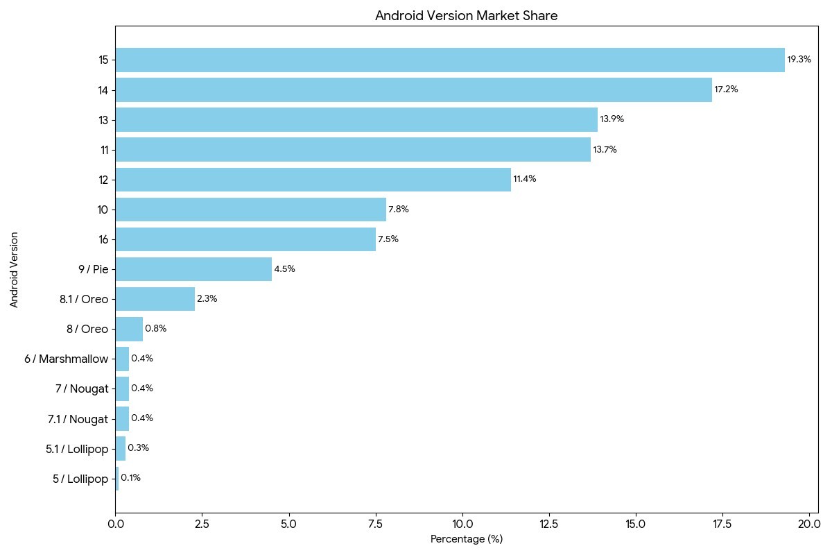 Menurut angka tersebut, Android 15 masih menjadi versi paling banyak digunakan saat ini dengan pangsa pasar sekitar 19,3 persen dari perangkat Android aktif di dunia, diikuti oleh Android 14 dengan persentase yang lebih rendah, sementara Android 16 berada di posisi ketiga atau keempat dalam daftar versi yang paling banyak dipakai.