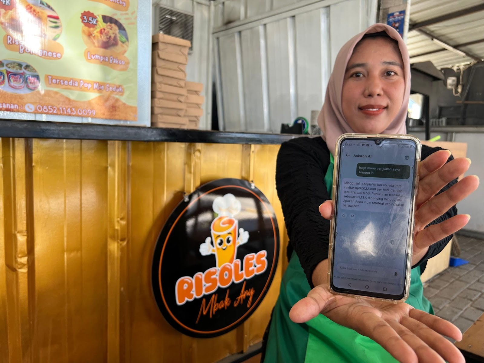 Efa memanfaatkan fitur GrabMerchant AI Assistant untuk memahami performa bisnisnya, termasuk tren penjualan, menu yang diminati pelanggan, serta waktu yang tepat untuk menjalankan promosi.