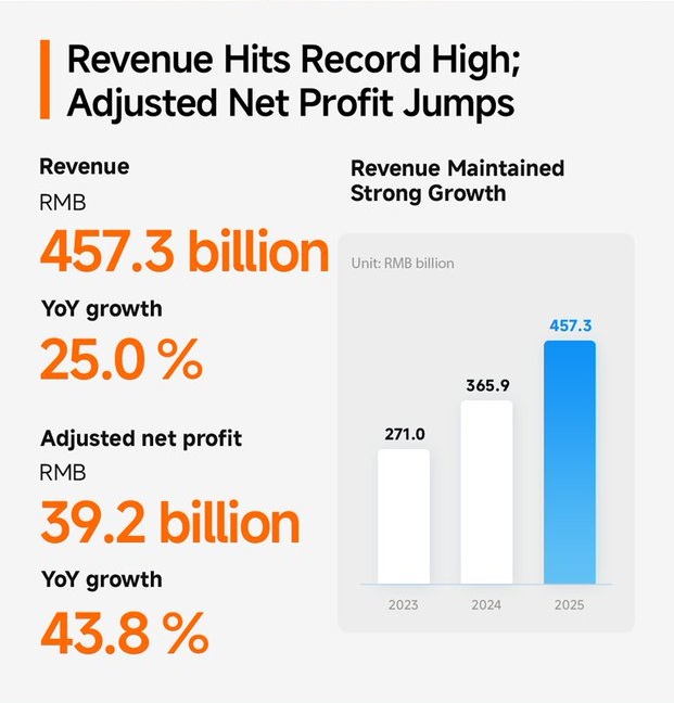 Pengiriman smartphone tetap menjadi kontributor utama pendapatan, sementara divisi EV mulai menunjukkan peran strategis sejak debut produk kendaraan listrik perusahaan.