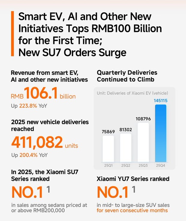 Di sisi lain, pengiriman 411 ribu unit EV menjadi indikator awal keberhasilan Xiaomi dalam memasuki industri otomotif listrik.
